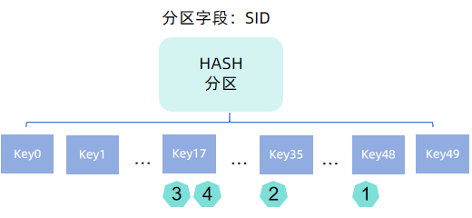 图 3-6 SID 字段按 HASH 分区划分为 50 个桶