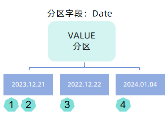 - 按天 VALUE 分区:属于同一天的数据都存储在同一个分区