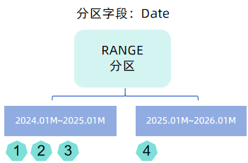 - RANGE 分区:用户指定分区范围,数据依据分区字段值划分到对应的范围中,一个范围对应一个分区。范围分区不支持自动拓展,用户需要手动调用函数 addRangePartitions。
