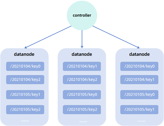 以一个 3 个数据节点的集群为例,数据按天值分区同时按股票代码哈希分区,双副本存储。集群中的数据存储架构如下图所示(最小的蓝色方块表示分区的一个副本):