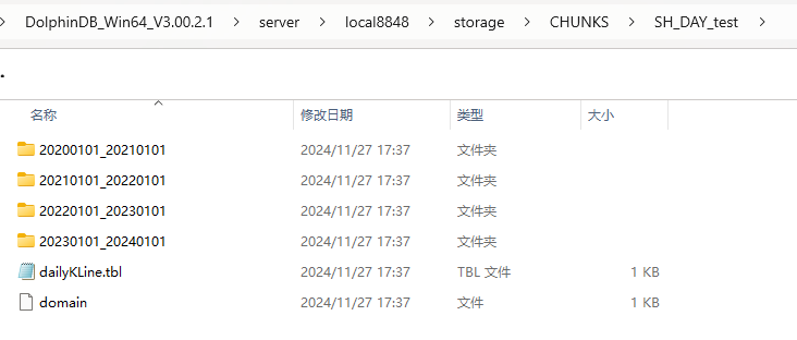 "dfs://" 用于声明数据库的类型是分布式数据库,除此以外,还有 "oltp://" 用于声明在线事务处理数据库。所有 "dfs://" 开头的数据库中的数据都存储在 volumes 参数配置的路径下,可通过 getConfig("volumes") 查看。