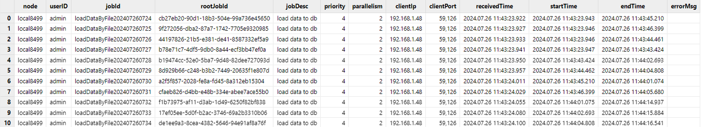 each(createDataLoadJob{dbName, tbName, schema}, dataPath + file_list)通过 getRecentJobs函数查看最近写入任务的状态,确保所有写入任务全部执行完成。