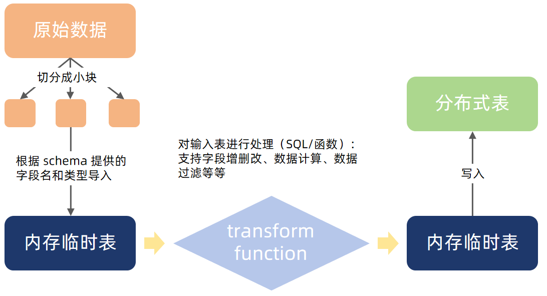 - 导入数据预处理:需要增加、修改、重排序字段;需要将多列数据存储成数组向量入库;导入时需要跳过表头、跳过指定行数