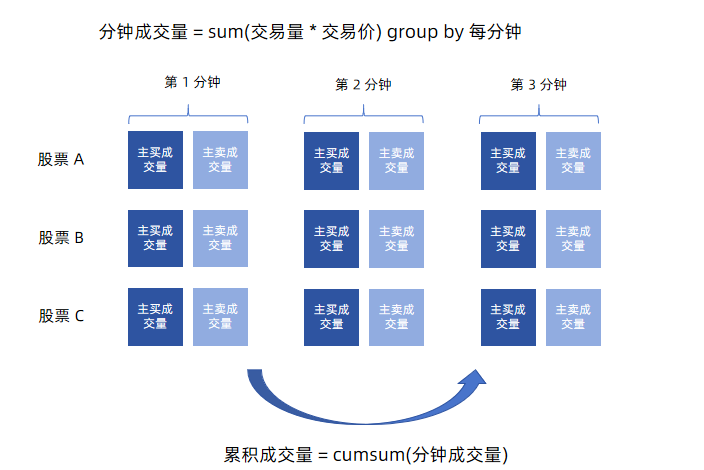 from data group by SecurityID, interval(TradeTime, 1m, 0) as TradeTime- 累积计算成交量(状态计算)