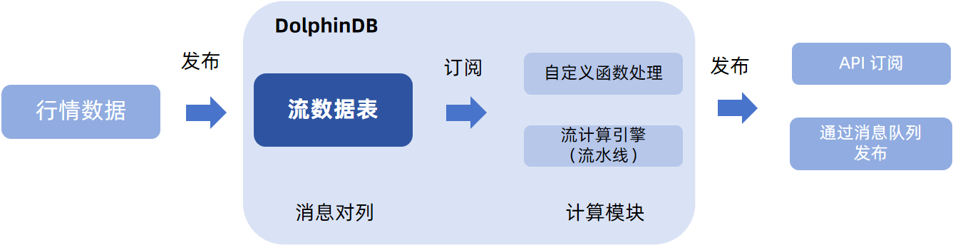 在实际金融场景下,一个完整发布-订阅流程:(1)行情数据发布到(写入)流表;(2)用户订阅流表进行计算;(3)计算结果通过 API、插件等发布到其他第三方平台,例如可视化平台展示、下游数据对接等等。