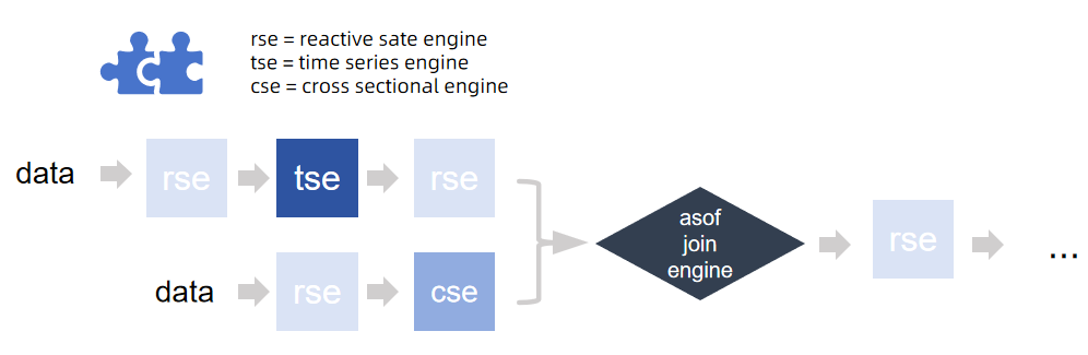 go定义流计算引擎。由于引擎是通过输出表设置为下一个引擎,来进行级联的,为保证脚本正常解析,引擎定义的顺序和业务数据流的逻辑是相反的。如本例中计算逻辑是 时序引擎 → 响应式状态引擎 → 横截面引擎,脚本中定义顺序则相反: