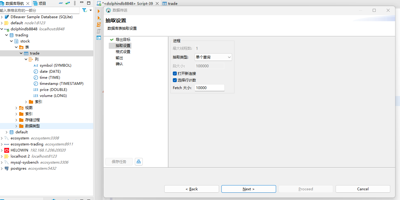 通常按导航的默认设置点击 “Next” 即可完成导出。至此,本文对如何通过 DBeaver 连接 DolphinDB,并在其中查看库表结构,读取数据,编写脚本等操作进行了详细的介绍。通过阅读本文,您可以在 DBeaver 中对 DolphinDB 有效地管理和操作数据 。