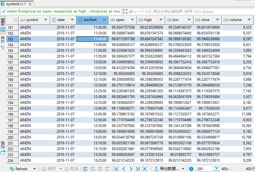 group by symbol, date, bar(time, 5*60*1000) as barStart