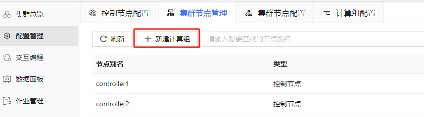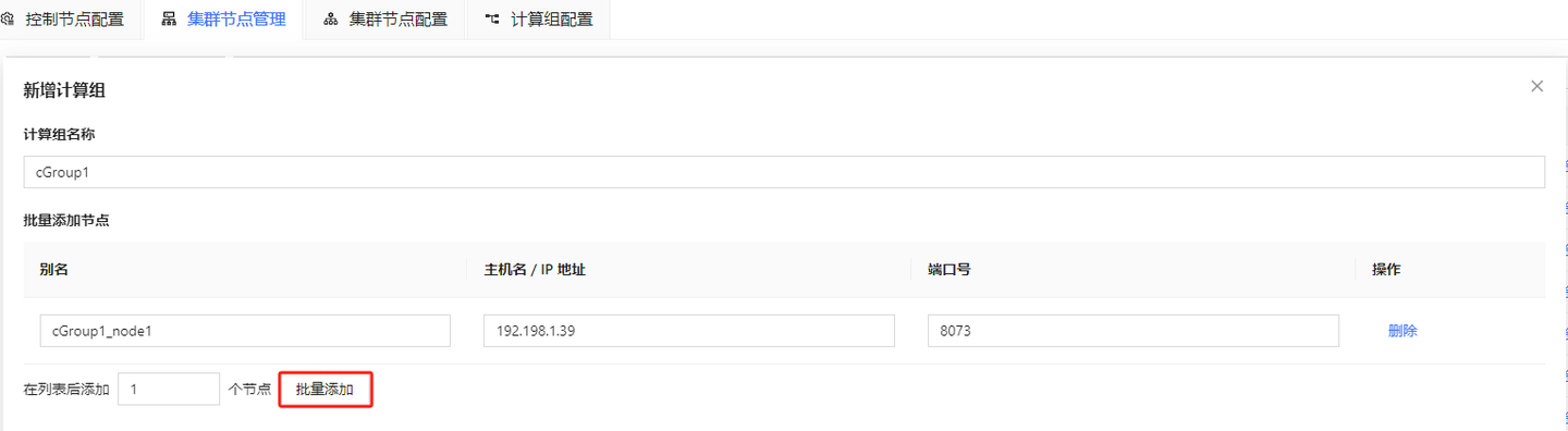 - 如图 2-5 所示,点击 新建计算组,可以设置计算组的名称并添加计算节点,点击 批量添加,可以对节点进行批量添加: