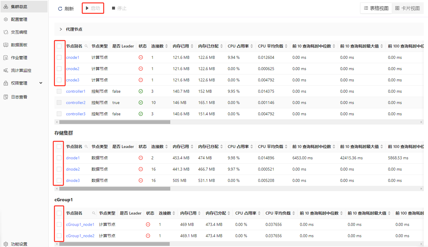 - 参考 高可用集群部署与升级 启动 P1, P2 和 P3 的控制节点和代理节点以及 P4 的代理节点,之后可以在 Web 管理界面启动或关闭数据节点、计算节点和计算组节点: