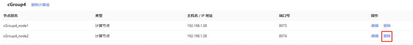 通过从计算组中删除计算节点进行缩容。如图 2-12 所示,在 集群节点管理 中,点击需要删除的计算节点右侧 删除 按钮即可完成节点删除。