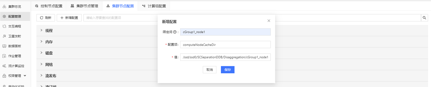 - 如果需要配置多个计算组且统一配置参数,或为计算组中的每个节点单独配置参数,可以在 配置管理 - 集群节点配置 中点击 新增配置 进行配置。如果需要为指定计算节点配置参数,则要在 限定词 中填写需要配置的节点名,如图 2-7 所示。如果要为多个计算组统一配置参数,则不需要填限定词。