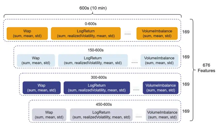 因子挖掘是量化交易的必备环节之一,随着量化交易和 AI 模型训练规模的发展,量化投资团队在投研环节势必需要处理大量因子数据。本文基于 Level 2 快照行情数据中的 10 档买卖单量价数据,分别计算了一级指标和二级指标。其次,对一级指标和二级指标进行 10 分钟级别的聚合计算,最终得到衍生特征。同时,考虑到特征具有时效性,将 10 分钟的特征切分成 0-600s(全部)、150-600s、300-600s、450-600s 四段,最终实现了 676 维聚合特征的计算。特征因子结构如下图所示:
