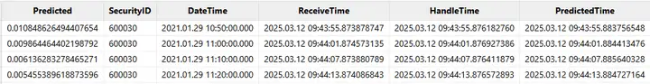实时预测的时间开销主要是实时因子计算和模型实时推理两个部分,本例我们通过在各个环节采用时间戳的方式进行统计。实时因子计算部分的具体方式是在数据注入引擎时打一个时间戳 ReceiveTime ,在数据计算结束时打一个时间戳 HandleTime ,取差值即可得到引擎计算因子的耗时。模型实时预测部分的具体方式是在模型推理结束时打一个时间戳 PredictedTime,取 PredictedTime 和 HandleTime 的差值得到模型推理耗时。