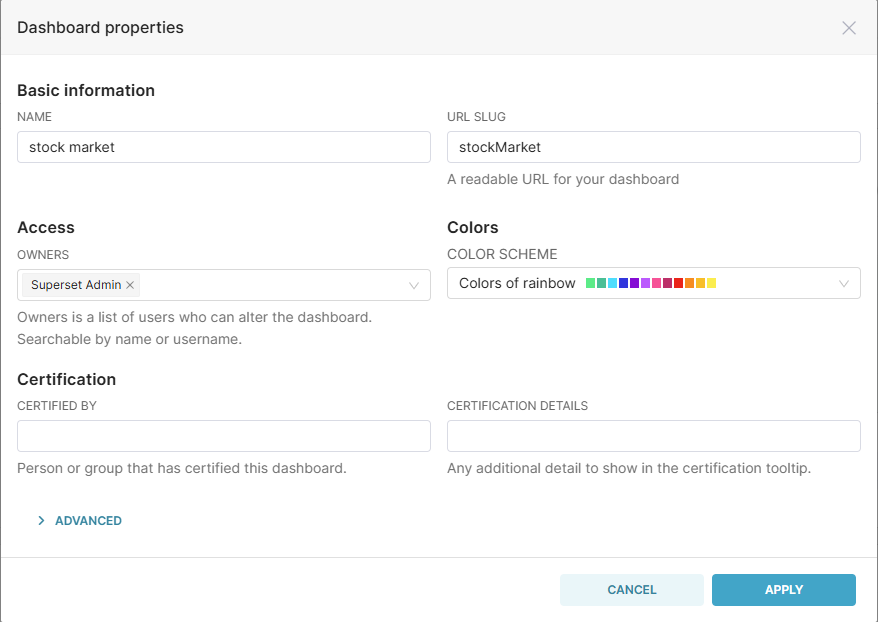 默认生成的 URL 形如 http://ip:port/superset/dashboard/p/8pGRY22dK9D/,比较难以记忆,可以在 URL SLUG 设置一个助记码,如图4-13中的 stockMarket,并通过http://ip:port/superset/dashboard/stockMarket 访问该仪表盘。