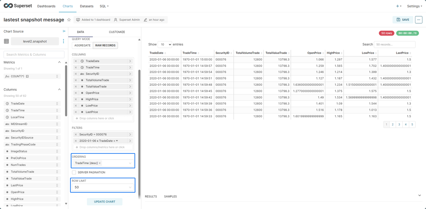 首先选择 Table,然后 FILTERS 中拖拽 SecurityID 选择股票。请注意字符串不需要手动加上引号或者双引号。接着,设置 ORDERING 按交易时间倒序,ROW LIMIT 选项设置为50。