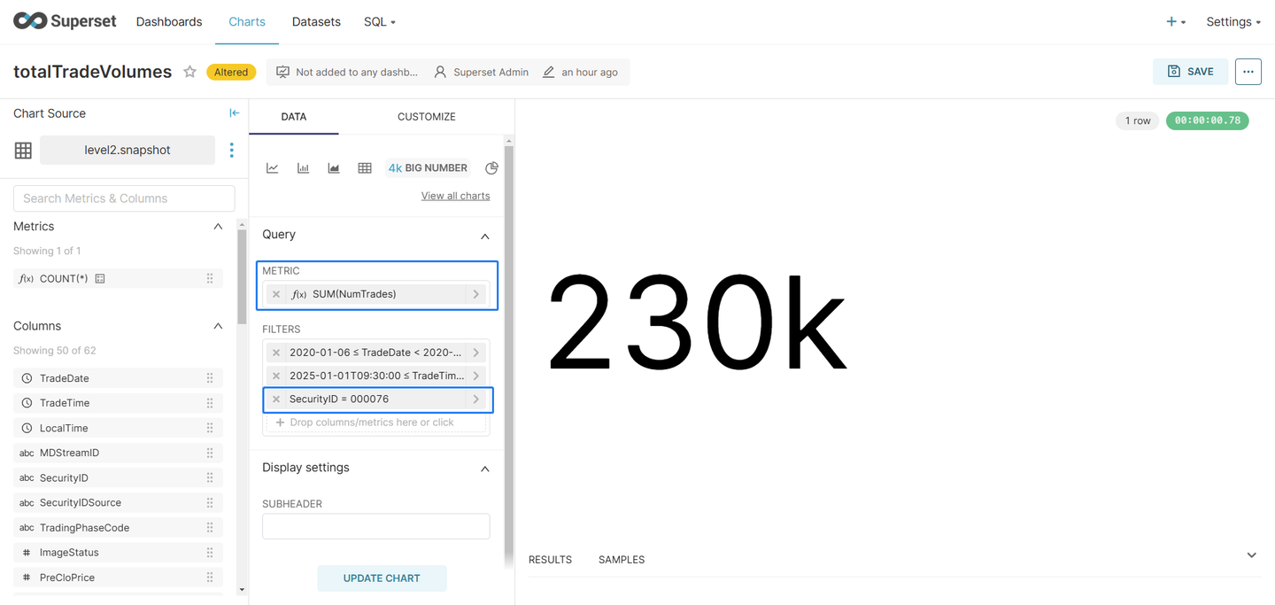 首先,选择 Big Number 图表,按照下图配置查询参数。然后在 METRIC 里写入 sum(NumTrades) 计算成交量,接着 FILTERS 中选择对应的股票。