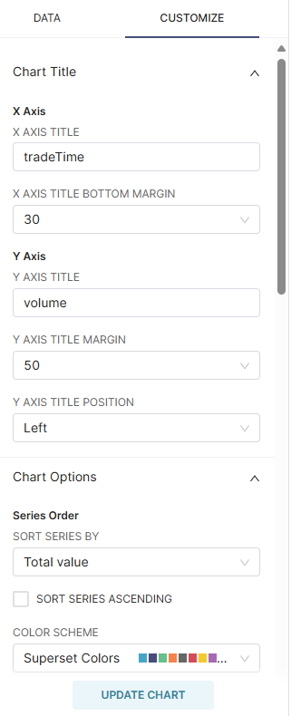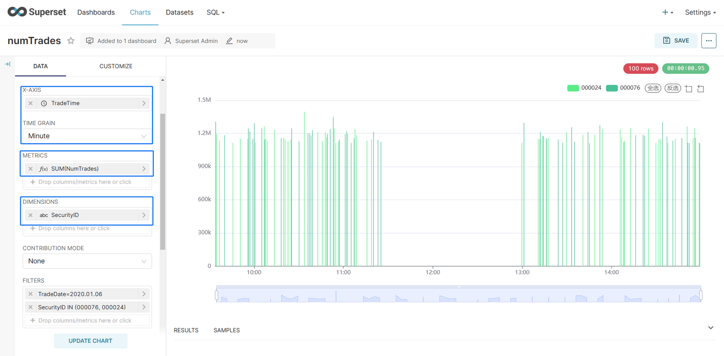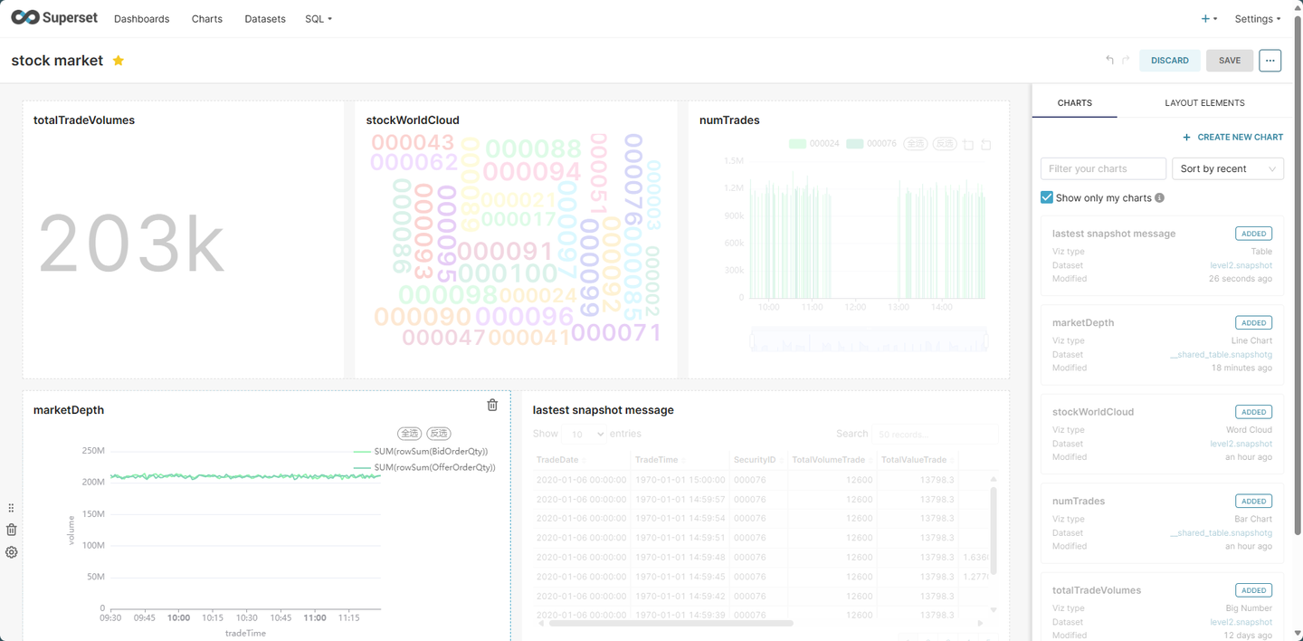 至此准备工作已经完成,进入数据可视化分析环节。可视化的魅力在于,能直观地展示数据情况,使得用户能够洞见数据中隐含的规律。以下案例将通过 Superset 绘制图表分析股票数据 ,包括市场深度趋势、成交量分布、行情展示等。