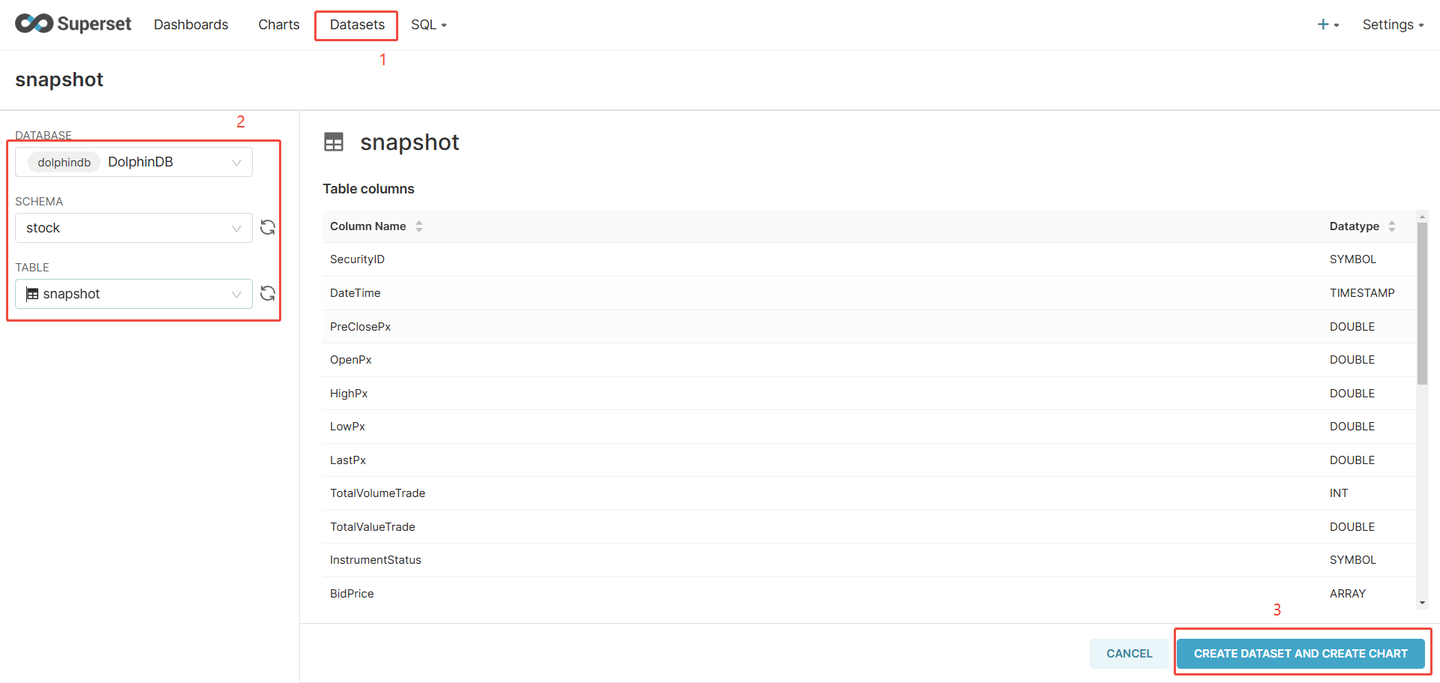 案例数据准备完成之后,分别创建 DolphinDB 连接及数据集,使得 Superset 可以访问并使用 DolphinDB 中的数据。