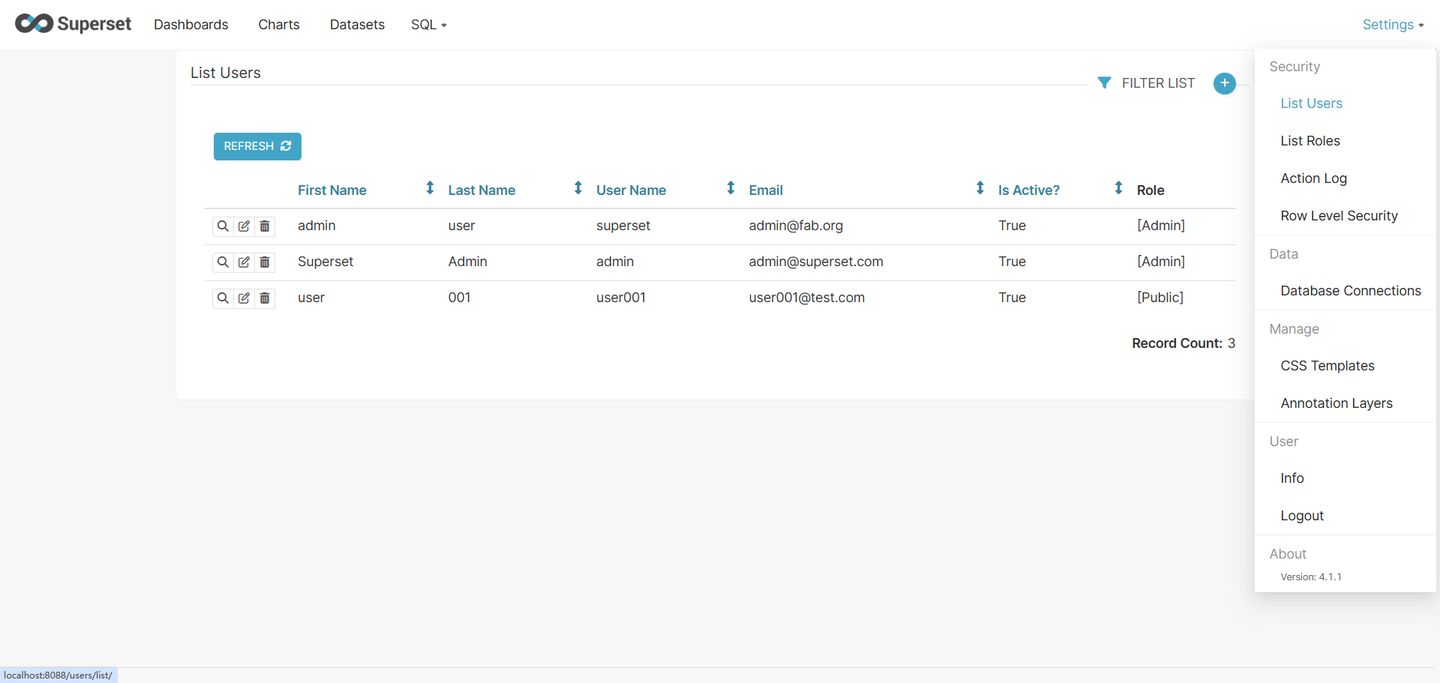 可以通过 Share → Copy permanlink to clipboard 可以获取仪表盘 URL 进行团队共享,访问者需要具备登录 Superset 的权限。Superset 支持工程化的权限管理,包括创建用户/组、设置图表的访问、编辑权限。在 Settings → List Users/List Roles 可以对用户、角色的权限进行设置。