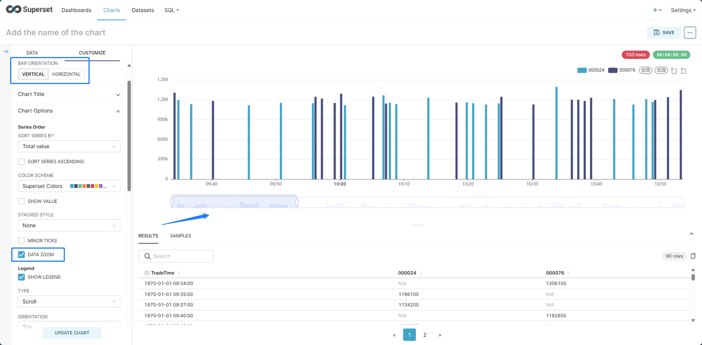 在 CUSTOMIZE中 可以选择水平/垂直控制柱形图的方向,点击 DATA ZOOM 可以缩放 X 轴范围,对感兴趣的 X 轴区间进行详细展示。