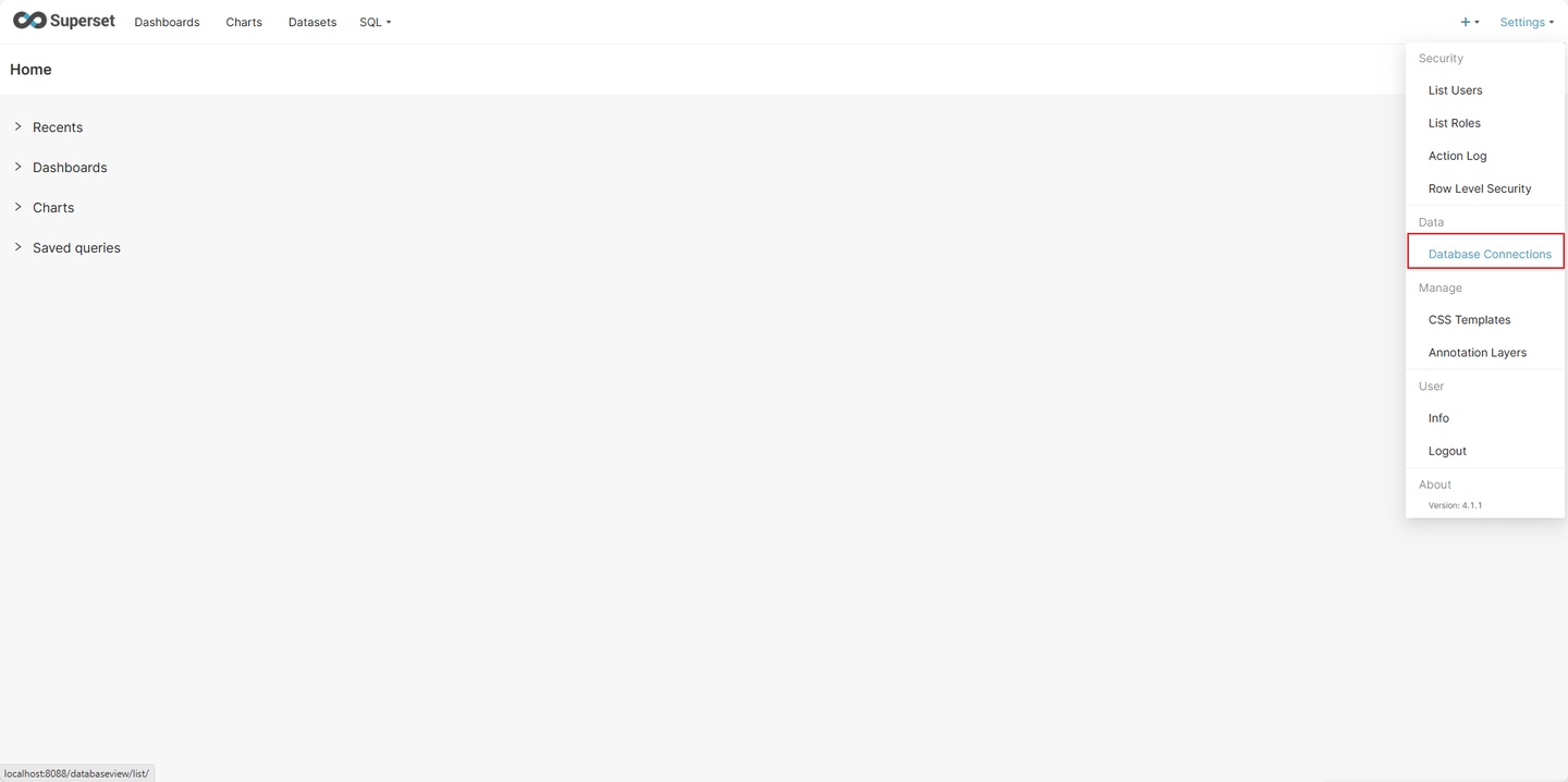 至此,Superset 部署完成。更多配置和管理方式,请参考 Configuring Superset | Superset。