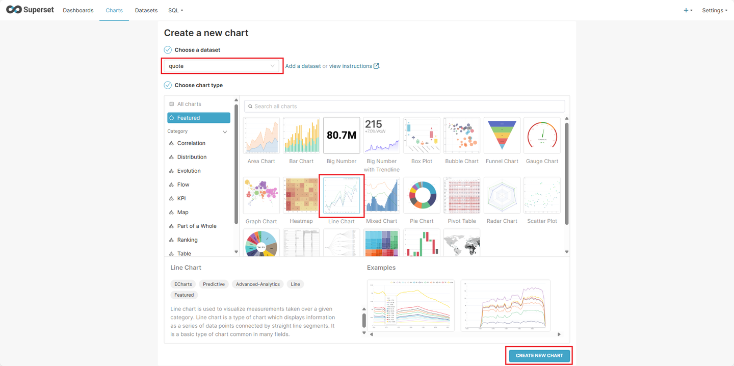 首先点击上方导航栏的 Charts,点击右上角的 + CHART 进入创建图表的界面。然后选择上文中创建的 snapshot 数据集,选择图表为 Line Chart,点击 CREATE NEW CHART。