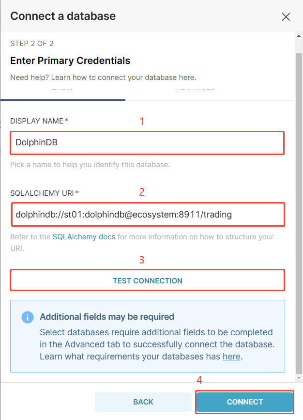 按照dolphindb://user:password@host:port/catalog的形式输入连接所需的参数,参数说明如下:
