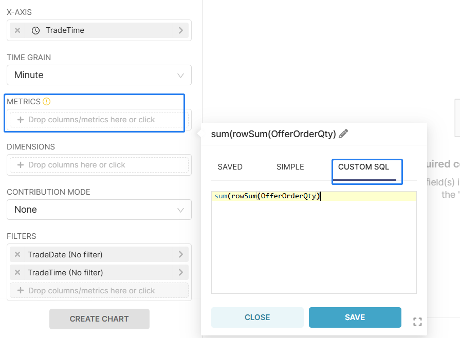 分别输入sum(rowSum(OfferOrderQty), sum(rowSum(BidOrderQty) 计算买卖队列。CUSTOM SQL 输入框中可以使用所有合法的 DolphinDB SQL,包括使用内置函数与自定义函数。因此您可以借助 DolphinDB 的分析能力(函数库及编程语言)完成一些复杂指标的可视化。 点击 CREATE CHART 生成图表。