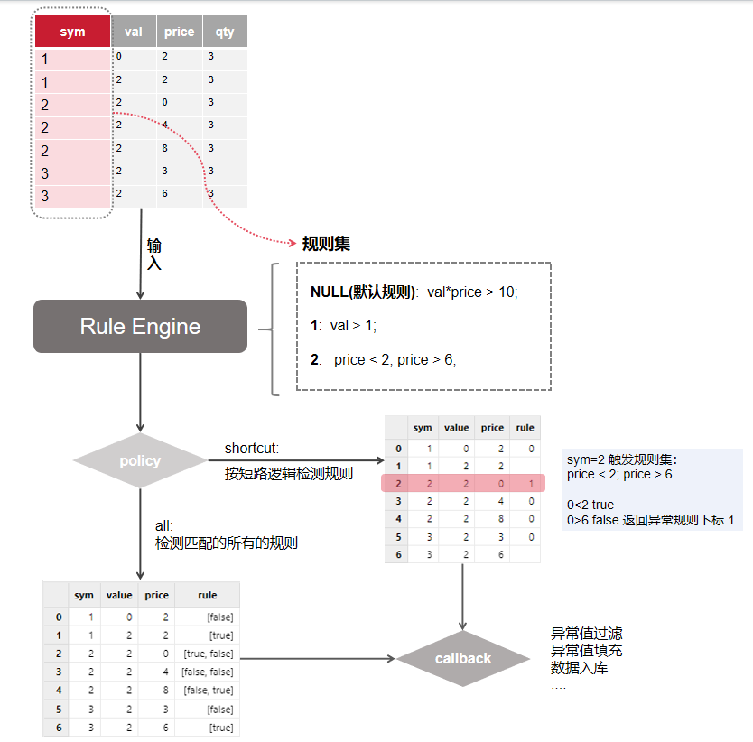 - 静态规则表:这是存储在 DolphinDB 中的静态信息表,包含每个测点的规则信息及对应的处理策略。