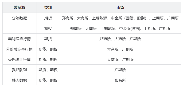 - 期货期权:分笔数据、套利深度行情、分价成交量行情、委托统计行情、委托队列和静态数据