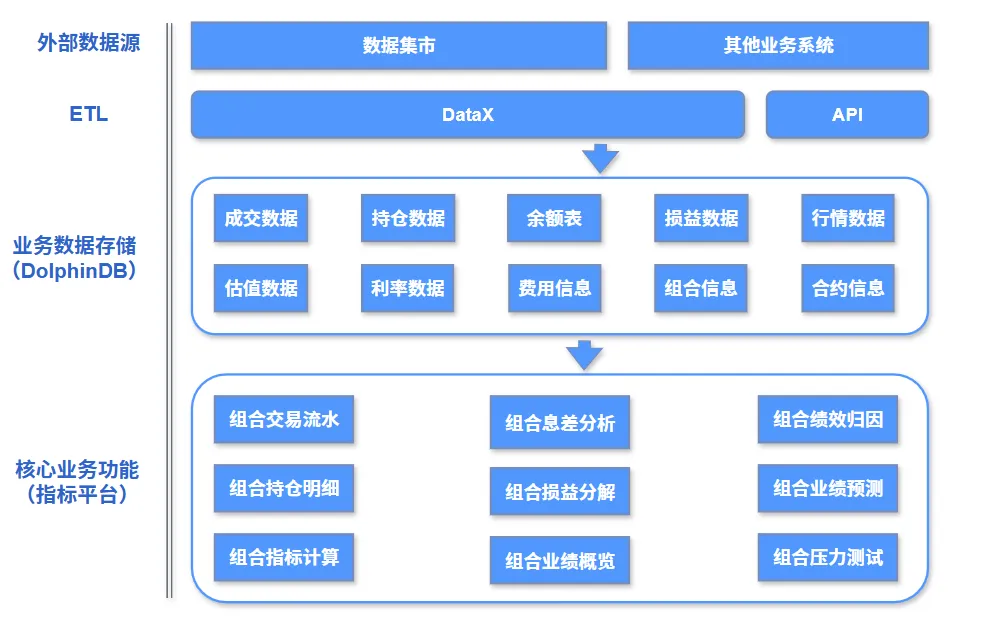 针对以上痛点,DolphinDB 为该头部券商打造了“现状透视 - 归因溯源 - 风险预判”三位一体的固收资产智能中枢。新系统以 DolphinDB 高性能时序数据库为底座,在其上构建的指标平台专注于优化与强化投资组合的核心管理能力,通过对仓位结构的精细监控、对绩效来源的科学分解、以及对潜在风险的前瞻性压力测试,为投资决策提供了坚实的数据基础与洞见。
